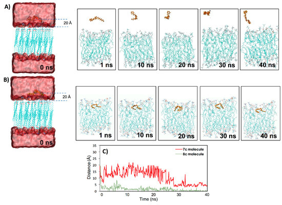 Interaction between 7c and 8c molecules with a lipid bilayer. Incorporation and interaction of the 7c (A) and 8c (B) molecules in the membrane along with 40 ns of the molecular dynamic (MD) simulation. In the figures (A) and (B) over time, the water molecules were removed to improve visualization. (C) Minimum distance obtained from two independent MD simulations, between the mass center of the 7c and 8c molecules and the surface of the lipid bilayer.