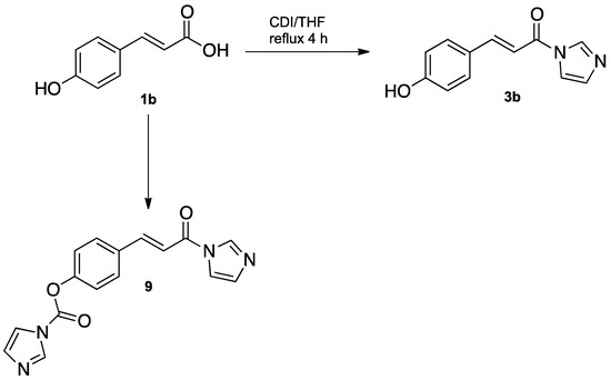 The synthesis of N-cinnamoyl salts (7a–c and 8a–c) is shown in Scheme 1. The first step for the synthesis of N-cinnamoyl salts was the production of amides 3a–b. In an attempt to obtain 3a–b, we tested the reaction of 1,1-carbonyldiimidazole (CDI) (2) with p-coumaric acid 1b in a 1:1 equivalent molar ratio (Scheme 2). Briefly, the reaction mixture, with THF as the solvent and under nitrogen atmosphere, was refluxed (4 h) and its progress was monitored by TLC. The TLC plates showed multiple spots in the reaction mixture; the GC-MS analysis of the reaction crude evidenced the formation of 3b and 9 with 40% and 30% conversion, respectively.