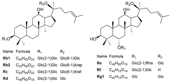 Ginsenosides are known as the key active ingredient of ginseng []. The diversity of ginseng efficacy is related to the structural variability of ginsenosides, also known as triterpenoid saponins []. More than a hundred ginsenosides have been reported in Panax ginseng []. Among them, ginsenosides Rb1, Rb2, Rc, Rd, Re, Rg1 (chemical structures are shown in Figure 1) are the most abundant and are usually regarded as the main ginsenosides. These six ginsenosides are normally used to evaluate ginsenoside abundance and for quality control. The accumulation of ginsenosides in ginseng is variable and can be influenced by the surrounding environment, including soil fertility, temperature, light, and humidity []. Even in the same area, the type and amount of ginsenosides are dependent on ginseng age [], harvest time [], and storage process []. Since ginseng’s bioactive properties depend largely on the contents and types of ginsenosides, accurately knowing the amount of ginsenosides is not only important for the pharmacological evaluation of ginseng products, but also for assessing the quality of ginseng from different regions.