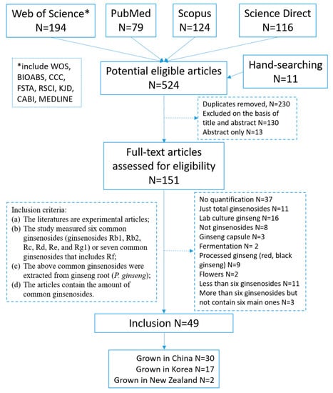 In order to obtain the average content of ginsenosides from China grown ginseng and Korea grown ginseng, we searched the scientific literature for ginsenosides analysis from ginseng grown in China and Korea. A total of 524 articles were located, and 151 potentially relevant studies were selected to full-text review after removing the duplicates (N = 230), abstract only (N = 13) and screening on the basis of title and abstract according to the inclusion criteria. After exclusion of 102 articles for the reasons given in Figure 2, we included 49 articles (article lists are supplied in the Supplementary Materials). Among these articles, 30 articles were about ginsenosides analysis for China grown ginseng, 17 for Korea grown ginseng, and two for NZ-grown ginseng.