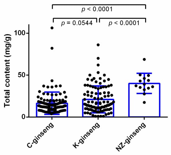 The average content of total ginsenosides in the ginseng roots grown in three different countries. Data were analyzed by one-way ANOVA using Graph pad prism 6 software and expressed as mean ± SE. Differences were considered significant if p < 0.05. Each dot represents one batch of ginseng sample test datum. C, K, and NZ-ginseng refers to China (n = 113), Korea (n = 106), and New Zealand (n = 14) grown ginseng, respectively.