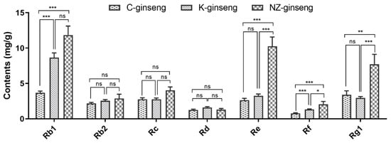 The average content of individual ginsenosides in the ginseng roots grown in three different countries. Data were analyzed by one-way ANOVA using Graph pad prism 6 software and expressed as mean ± SE. * p < 0.05, ** p < 0.01, *** p < 0.001. Differences were considered significant if p < 0.05. C, K, and NZ-ginseng refers to China (n = 113), Korea (n = 106), and New Zealand (n = 14) grown ginseng, respectively.