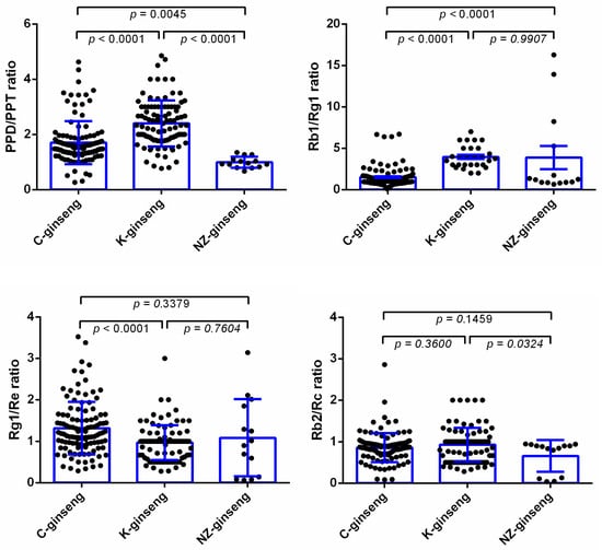The PPD/PPT, Rb1/Rg1, Rg1/Re, and Rb1/Rc ratios of ginsenosides in the ginseng roots grown in three different countries. Data were analyzed by one-way ANOVA using Graph pad prism 6 software and expressed as mean ± SE. Differences were considered significant if p < 0.05. Each dot represents one batch of ginseng sample test datum. C, K, and NZ-ginseng refers to China (n = 113), Korea (n = 106), and New Zealand (n = 14) grown ginseng, respectively.