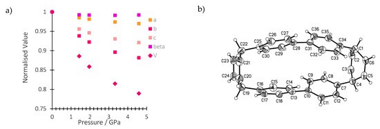 (a) Variation of the normalised lattice parameters and unit cell volume of H4[6]CPP as a function of pressure. (b): H4[6]CCP structure in the crystal at ambient pressure and 298 K. Ellipsoids are shown with 30% probability surfaces.