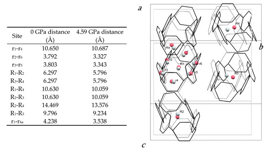 (left) Table of centroid–centroid distances in the H4[6]CPP structure at 0 and 4.59 GPa. (right) Structure of H4[6]CPP viewed along a* at ambient pressure (black wireframes) and at 4.59 GPa (grey wireframes), indicating intramolecular and intermolecular distances calculated between centroids (pink for 0 GPa and grey for 4.59 GPa). Hydrogen atoms are removed for simplification. Molecular centroids are indicated with R1, R2; the centroids of individual rings are labelled r1, r2.
