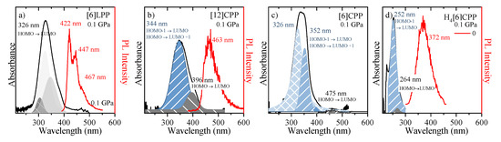 The absorption spectra of both CPPs contain shoulder-like bands at around 396 nm in [12]CPP and 475 nm in [6]CPP, which correspond to the HOMO-LUMO absorption S0 to S1 [56]. By contrast to the LLPs, a higher value of n implies a larger HOMO-LUMO band gap [30,31]. Although these HOMO-LUMO transitions are forbidden by symmetry, the imperfect geometry of CPPs leads to small perturbations in the electronic wave function that result in a small but non-zero oscillator strength and the presence of HOMO-LUMO absorption at low intensity [55]. The inhomogeneous broadening of the [6]LPP and [n]CPP spectra is due to conformational structural variations related to irregular variations of the dihedral angles [30,31,55].