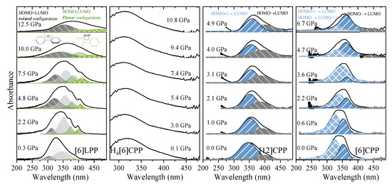 In Figure 9, the shift of the absorption bands as a function of pressure is shown for the four systems discussed here. For all the phenylene systems, the absorption redshifts with pressure as a result of a decrease in the band gap. However, the rate at which this occurs is strongly dependent on the π configuration. Table 4 reports the coefficients of the absorption shift estimated for all the systems studied here. In systems with large π conjugation, such as picene, the S1 band has been observed with a redshift of ~8 nm/GPa. This energy gap closure is a result of the decrease in the intramolecular distances involving π-π interactions [59]. The torsional freedom of [6]LPP compared with that of picene leads to subtle changes in which the absorption bands redshift by ~1 nm/GPa. In the case of H4[6]CPP, there are slight changes in the slope of the absorption edge going from ~2 nm/GPa to ~−1 nm/GPa at around 8 GPa, which can be associated with the pressure-induced interactions between intramolecular biphenyl as inferred from the FTIR and Raman observations. As such, [6]LPP and H4[6]CPP present analogous trends, whereas the pressure-induced interactions between cofacial phenyl units in the cycle deviates the slope (see FTIR section).