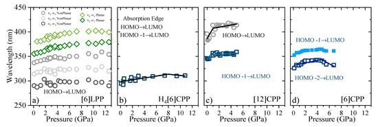 The H4[6]CPP pressure-dependent absorption measurements were done using H-silicon carbide as anvils, which limits the spectral range to 300 nm and above, and only part of the S0→S1 absorption 252 nm could be detected. In Figure 8b, the absorption edges at different pressures are presented.