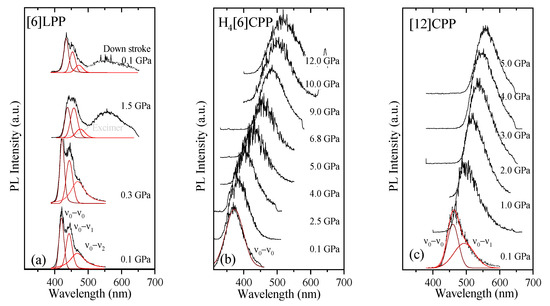 TP fluorescence spectra of [6]LPP were measured using 740 nm as an excitation line. The fluorescence spectra of [6]LPP are characterised by the S1→S0 emission, which shows a well-defined vibronic pattern. [6]LPP initially was loaded without a PTM; however, during the high-pressure fluorescence experiments of [6]LPP, the formation of an excimer at pressures below 2 GPa was characterised by a fluorescence band at around 550 nm. The excimer formation is a very interesting result because it has strong intensity at very low pressure. This behaviour is different to benzene, which showed a sudden intensity exchange between the monomer and excimer transitions at around 6.1 GPa [61]. Here, formation of the excimer is likely due to the presence of defects among the crystal grains and not the reactivity trigger as IR showed much higher pressures are required. Consequently, it was necessary to work with an inert PTM to avoid the formation of such defects. In these conditions, the excimer was still present. On the other hand, as seen in Figure 10a, the different vibronic transitions are observed as they all redshift with increasing pressure. Figure 11a shows the shift of the three vibronic contributions as a function of pressure. Our results are in excellent agreement with those of Guha et al. [59]. All the data reported show a significant band gap decrease with increasing pressure, with an average linear pressure coefficient 2 nm/GPa calculated above planarisation (ca. 1 GPa), which is in agreement with the absorption measurements.