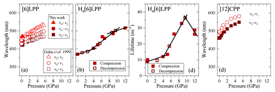 Emission data represented as a function of pressure for the different crystalline compounds. (a) Transition energies of [6]LPP: empty symbols correspond to the experimental results from Guha et al. [60]. (b) Transition energy (0-0) of H4[6]CPP. (c) Fluorescence lifetime of H4[6]CPP. (d) Transition energies of [12]CPP.