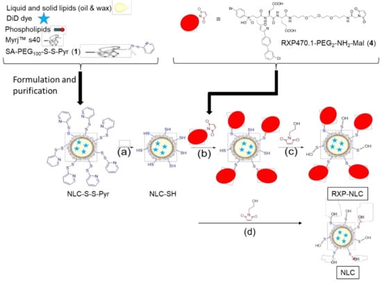 Synthesis of RXP470-modified nanostructured lipid carriers (NLC) and control NLC. (a) Addition of dithiothreitol (DTT), incubation 2 h at room temperature, then dialysis overnight. (b) Addition of RXP470.1-maleimide, 4 h incubation at room temperature, then overnight at 4 °C. (c,d) Addition of 1-(2-hydroxyethyl)-1H-pyrrole-2,5-dione, 30 min incubation at room temperature, then dialysis for 24 h.