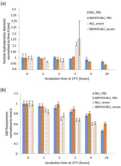 The colloidal stability of DiD-loaded NLC and RXP-NLC in human serum was evaluated by DLS and fluorescence measurements performed at different times after particle incubation at 37 °C at a concentration of 5 mg of particles/mL of serum (Figure 3). Colloidal stability in PBS was also measured as control. The particle hydrodynamic diameter remained constant for 24 h when diluted particles were incubated at 37 °C in PBS buffer, but about 50% DiD fluorescence was lost in 24 h due to partial dye leakage or degradation in such diluted medium at 37 °C. This was consistent with previous data [55]. NLC and RXP470-NLC were stable for two hours at 37 °C in human serum, since DLS particle profiles were not significantly modified during this period of time. At 3 h after particle incubation, particle DLS peaks were enlarged and Z-average shifted to higher values (Figure 3a). After 4 h, no peak could confidently be attributed to the nanoparticles and only large background noise due to serum proteins was observed. This corresponded with increased fluorescence loss of the nanoparticles, which was indicative of their destabilization (Figure 3b). Overall, these results indicated that both NLC and RXP470-NLC were stable in serum for at least two hours.