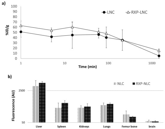 The in vivo fate of unmodified lipid nanoparticles (NLC) and RXP470.1-functionalized ones (RXP-NLC) was investigated in ApoE-/- mice fed with a high-fat rodent diet for 10 weeks to develop mature atherosclerotic plaques. The particle blood clearance and biodistribution were evaluated following intravenous administration of either NLC or RXP-NLC at a dose of 5 mg/mouse. For each set of nanoparticles, pharmacokinetics was established through the collection of blood samples at different time points and quantification was performed through fluorescence measurement at appropriate DiD excitation and emission wavelengths. As shown in Figure 4a, NLC and RXP-NLC displayed very similar blood clearance profiles, with a blood plasma half-life of 1 h for both particles. This rapid distribution phase was followed by a slower decline of the plasma concentration, which led to a non-negligible portion of fluorescence remaining 24 h after injection (10%). At this time point, organs (liver, spleen, kidneys, lungs, femur bone, and brain) were harvested and tissue fluorescence was evaluated. As illustrated in Figure 4b, particles mainly accumulated in liver, which was a hallmark of mainly hepatic-biliary metabolism, while fluorescence in other organs was quite low. This biodistribution pattern was not significantly affected by RXP470.1 functionalization, and was consistent with previously published data for this type of lipid nanoparticles [29,55].