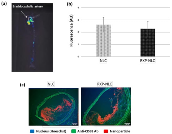 Tissue and histology analysis after NLC or RXP-NLC injection in ApoE-/- mice. (a) Representative ex vivo fluorescence image of whole aorta harvested 24 h after intravenous injection of 5 mg particles/mouse. (b) Quantitative analysis of fluorescence signal within brachiocephalic artery (ROI = 1 mm2) and comparison between naked nanolipid carriers (NLC, n = 3) and RXP470.1 functionalized ones (RXP-NLC, n = 3). AU: Arbitrary units. (c) Aorta cross-section histology (fluorescence microscopy) of tissues harvested 48 h after intravenous injection. Blue: Nucleus (Hoeschst), Green: Anti-CD68 Ab (macrophage marker) and tissue auto-fluorescence, Red: DiD-loaded NLC. Scale bar: 100 µm.