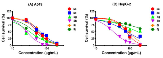 Anticancer activity studies were performed for the synthesized compounds 5a, 5e, and 5g–j (which showed higher antimicrobial activity than the others) against A549 and HepG-2 cells [15,21]. All the tested compounds showed good cytotoxic activity against A549 cells. However, 5a, 5e, 5i, and 5j showed good in vitro cytotoxic activity against both A549 and HepG-2 cells (Figure 3). However, 5a, 5e, and 5i showed moderate activity against HepG-2 cells (Table 5). The cytotoxicity properties of synthesized compounds against A549 cells were observed at concentrations of 275 μM to 58 μM. The cytotoxic results showed that among all the tested compounds, 5a, 5e, 5g, 5h, 5i, and 5j showed promising anticancer activity against A549 cells. Compounds 5g and 5h showed potent cytotoxic activity against A549 cells with IC50 values of 72 and 58 µM, respectively (Table 5). A toxicity study of all synthesized compounds including 5a, 5e, and 5g–j against human normal IMR90 cells showed no toxicity up to 250 µM (vide infra, supporting information).