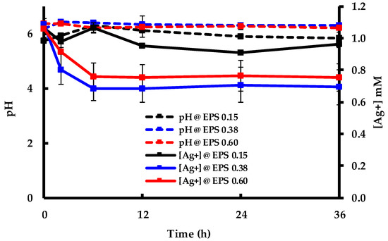 The adsorption of Ag+ to EPS at 0.15, 0.38, and 0.60 mg mL−1 EPS in the dark was measured in triplicate, and the results are presented in Figure 1. The figure shows the change of pH and [Ag+] over the first 36 h of the experiment. Although no significant change in pH was observed, there was an obvious disappearance of Ag+ in the liquid phase. The equilibrium concentration was reached within 6 hours, and Ag+ concentration remained constant for the remainder of the experiment. Additionally, more Ag+ was removed from the liquid phase as the EPS concentration increased. These results indicate that Ag+ adsorbs to EPS in the dark, without the need of photon energy. The stable pH, as shown in Figure 1, indicates that there was no conversion of Ag+ to Ag0, which is known to produce H+ and therefore lower the pH [17]. In conjunction with the data presented in the following sections, this suggests that Ag+ adsorption to EPS is the first step of the EPS-mediated AgNP biosynthesis process and can explain the subsequent steps of the reaction mechanism.