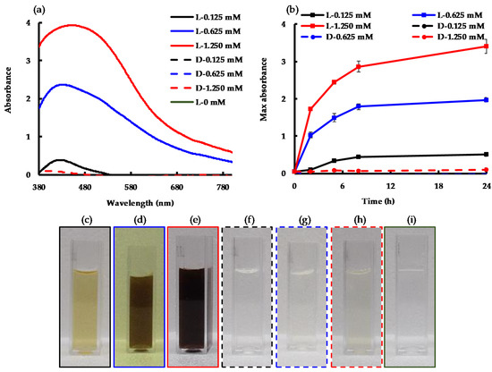 (a) Spectrophotometric measurements at 24 h; (b) Change of silver nanoparticle (AgNP) surface plasmon resonance (SPR) intensity vs. time over 24 h; (c–i) Reaction mixture in 1 cm pathlength cuvettes after 24 h of synthesis (c) L-0.125 mM; (d) L-0.625 mM; (e) L-1.250 mM; (f) D-0.125 mM (g) D-0.625 mM; (h) D-1.250 mM; (i) L-0 mM. “L-” indicates “in the light”; “D-” indicates “in the dark”; the values following are the concentrations of Ag+ in the synthesis reaction. The border of each photo (c–i) matches the series lines in (a,b).