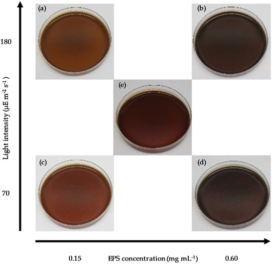 For the factorial design method, a 22 (2 level 2 factor) factorial design was adopted [38]. Light intensity and EPS concentrations were used as two factors at low (−) and high (+) levels, as presented in Table 3. The conversion from coded to real world value is given in Equation (1).