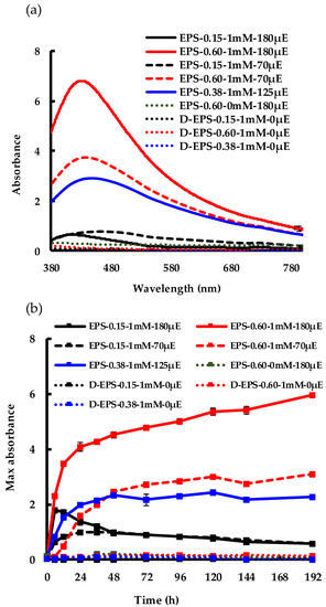 AgNP synthesis at different light intensities and EPS concentrations: (a) spectrophotometric measurements at 192 h; (b) change of SPR intensity vs. time over 192 h.