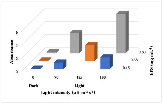 To further investigate the impact of light on the AgNP biosynthesis process, experiments were carried out over a range of purified EPS concentrations in combination with varying light intensities. Figure 4 and Figure 5 show the results from a 22 (two level two factor) factorial design experiment (details are provided in the Materials and Methods section). The images presented in Figure 4 visually confirmed a greater formation of AgNPs at increased EPS concentration and light intensity, while the AgNO3 concentration was constant (1 mM). In addition, Figure 5a shows the AgNP SPR band at wavelengths ranging from 425 nm to 480 nm at 192 h after Ag+ addition. The highest SPR absorbance was obtained from the EPS-0.60-1 mM-180 μE sample, the synthesis reaction with the highest input of light and EPS, corroborating the macroscopic aspect of Figure 4. On the other hand, when the amount of EPS or light intensity was decreased, the intensity of the SPR band decreased. Samples kept in the dark exhibited a very weak to no SPR band, regardless of the EPS concentration. Figure 5b shows the change of the SPR intensity vs. time over 192 h, measured at the maximum absorbance wavelength. It is noticeable that the SPR intensity increased as both the light intensity and EPS concentration increased. However, at low EPS concentration and high light intensity, the particle did not stabilize, as was seen by an increase in the AgNP SPR band in the first 6 hours and a ~67% decrease over time. As EPS concentration increased, there was a ~93% increase in AgNP production. These results indicate that both EPS concentration and light intensity are limiting variables for the biosynthesis process, because they are both necessary to promote the synthesis of stable AgNPs. This finding agrees with the results obtained from the OFAT experiment (Figure 1 and Figure 2). The maximum synthesis of AgNPs took place at maximum light intensity and EPS concentration, as depicted in the 3D bar graph in Figure 6. The data series of the dark control experiments stayed close to the x-axis and did not show any SPR absorption bands. Additionally, EPS in light without Ag+ (i.e., EPS-0.60-0 mM-180 μE sample in Figure 5a,b) showed no absorption. These results indicate the conversion of Ag+ to Ag0 and AgNPs by both light and EPS, followed by AgNP stabilization by EPS. Overall, the current findings suggest that the initial increase in SPR absorbance is related to the light intensity, while the final yield is related to the EPS concentration. This information could be exploited to design further experiments that will determine the rate limiting substrate, and therefore will predict the kinetics and yield of the biosynthesis process, paving the way to scalable, permanent PBR systems.