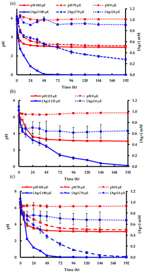 Figure 7 shows the change in pH and consumption of Ag+ in the factorial design experiment over 192 h. A significant difference in both pH and [Ag+] was found between the experiments conducted in light and dark conditions (Figure 7a–c). In the dark, no obvious change in pH was observed, corroborating the results discussed in Figure 1. Ag+ disappeared from the aqueous phase in the dark experiments, with a higher Ag+ removal rate at higher EPS concentrations (Figure 7b,c). The Ag cations were adsorbed by the EPS biomolecules and, consequently, could not be detected by the silver-ion-selective electrode. Although Ag+ adsorption occurred in the dark, the AgNP SPR absorption band was only observed in the presence of light, again verifying that photons are an obligate input for the AgNP synthesis reaction (Figure 5). More interestingly, at the same EPS concentration, the rate of decrease in both pH and [Ag+] was faster at higher light intensities than at lower intensities, indicating that the production kinetics were related to photon input (Figure 5b and Figure 7a,c). In addition, the acidification of the reaction mixture was measured by a change in pH from neutral (~7) to acidic (~3), indicating that during the synthesis process electrons were transferred to Ag+ to produce Ag0, with the charge balance being satisfied by the production of H+. However, the possible sources of H+ and its contribution in the biosynthesis process are further discussed in the following section.