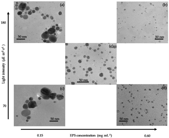 Transmission electron microscope (TEM) micrographs of AgNP samples: (a) EPS-0.15-1 mM-180 μE; (b) EPS-0.60-1 mM-180 μE; (c) EPS-0.15-1 mM-70 μE; (d) EPS-0.60-1 mM-70 μE; (e) EPS-0.38-1 mM-125 μE.