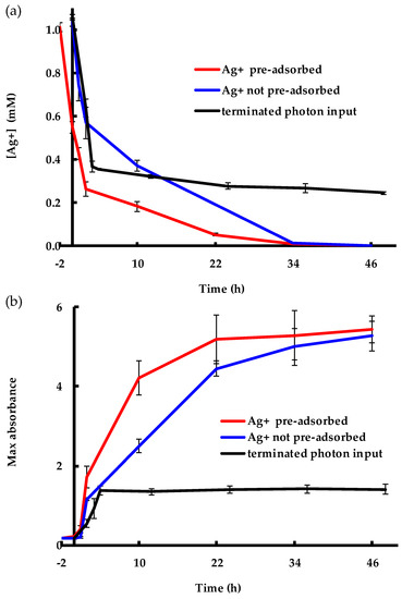 Figure 10 shows the results from the three experiments where: (i) Ag+ was pre-adsorbed by the EPS that were challenged by AgNO3 in the dark for 2 h before the reaction mixture was exposed to light; (ii) Ag+ was not pre-adsorbed; and (iii) photon input was terminated after 2 h of synthesis (the detailed method is presented in the Materials and Methods section). Figure 10a shows the concentration of Ag+ in the aqueous phase while Figure 10b shows the corresponding development of the maximum SPR of AgNPs for the same experiments. Upon investigating both figures, it is worth noting that Ag+ adsorption prior to light exposure made the SPR band more intense compared to the process without pre-adsorption (red vs. blue curve in Figure 10b). With time, the two SPR curves converged to the same value (~5.4). As the AgNP formation continued, the Ag+ was continually removed from the aqueous phase while AgNP formation continued, which indicates a light-driven conversion of Ag+ to AgNPs. The Ag+ concentration curves (Figure 10a) of these two experiments eventually met at 34 h, but a dissimilar concentration curve was observed due to Ag+ adsorption within the first 2 hours for the pre-adsorbed case that made AgNP formation more apparent after the start of illumination, compared to the case where Ag+ was not allowed to adsorb before illumination. For the third experiment, Ag+ adsorption and AgNP formation occurred at the same time in the beginning; however, photon input was terminated at 2 h. Nevertheless, the AgNP formation continued for another couple of hours and, interestingly, the absorbance that could be attributed to AgNPs more than tripled after the termination. This phenomenon could be attributed to the continued growth of the as-produced particles before being capped by the EPS to terminate growth [17], therefore indicating that the stabilization process is photon-independent. In contrast, the adsorption of Ag+ continued at a very low rate compared to the other two experiments where AgNP formation occurred. In summary, the current results indicate that both Ag+ adsorption and AgNP stabilization do not depend on light, whereas Ag+ to Ag0 conversion does. These results corroborated the results discussed in Figure 1, Figure 2, Figure 3, Figure 4, Figure 5, Figure 6 and Figure 7. Moreover, these findings suggest that EPS play a direct role in the biosynthesis process by adsorbing Ag+.
