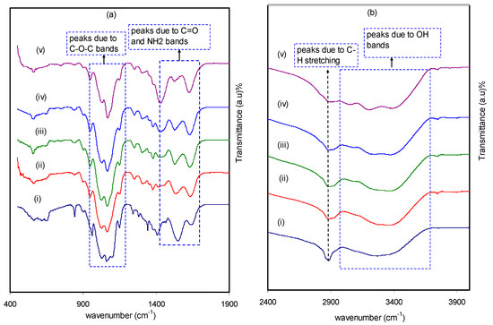 Spectrum of (i) CSPX0 (pure CS:PEO), (ii) CSPX1, (iii) CSPX2, (iv) CSPX3, and (v) CSPX4 in the range (a) 400 cm−1 to 1900 cm−1, and (b) 2400 cm−1 to 3900 cm−1.