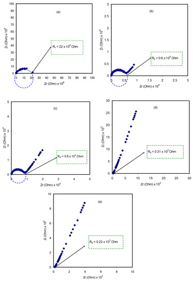 The impedance plot of the blended electrolyte samples at room temperature is presented in Figure 2. At the high frequency region, it can be clearly seen that there is an incomplete semicircle, whereas at the low frequency region, there is a spike shape appearance. The former appearance is attributed to the bulk responses, i.e., electrolyte, and the latter case is attributed to the capacitor formed at the double layer in the electrode/electrolyte interface region, owing to accumulation of free charges [47,48,49]. The diameter of the semicircular portion is reduced as the salt content increases. This implies that charge carriers, which are the ions, can move throughout the sample, considering the sample body as a resistor parallel to a constant phase element in the equivalent circuit model [49]. At low frequencies, the impedance plot response is expected to be a straight line, parallel to the imaginary axis. However, double layer capacitance causes the curvature as a consequence of the electrode polarization effect at the blocking electrodes [50,51,52]. To determine the DC conductivities (σdc), complex impedance (Z*) comprising the imaginary (Zi) and real (Zr) parts can be employed using the following relationship: