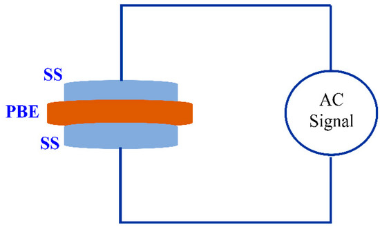 Schematic diagram of impedance measurement which consists of two identical stainless steel (SS) electrodes. The inserted sample is a polymer blend electrolyte (PBE).