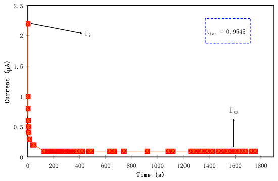 To determine the main or dominant charge carrier species in polymer electrolytes, it is the best choice to use transference number measurement (TNM) using DC polarization technique. As mentioned in Section 2.3, the measurement technique was comprised of applying DC voltage to the samples with a characteristic potential window, and followed by plotting the resulting current versus time [53]. Figure 4 shows the current with respect to time plot for the CSPX4 blend electrolyte film with highest conductivity. It should be noted that the plot reveals the formation of the relatively highest conducting electrolyte, where the polarization curve shows a recording of the current that raised from 0.8 V until reaching saturation state. Accordingly, the current decayed drastically prior to reaching the steady state. At the steady state, when the polarization of the electrochemical cell is taking place, the remaining current flow can be a reflection of electron transfer rather than ion transport. This is also explained in terms of the blockage, resulting from ion accumulation at the interfacial region of stainless steel electrode/electrolyte, where only electrons can transfer between the electrolyte and solid electrode phases [54]. The relatively high conductive electrolyte connected the two stainless steel electrodes (SS) can perform facilitating charge transport and electron transfer at the interfacial region. The following equations were used to calculate both the ion (tion) transport and the electron (tel) transference number:
