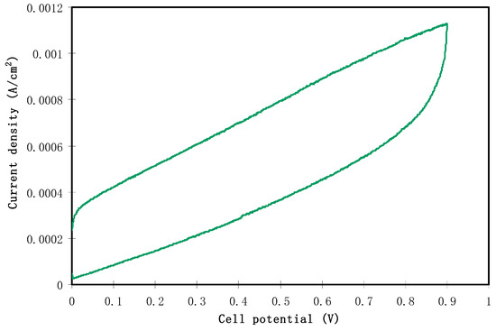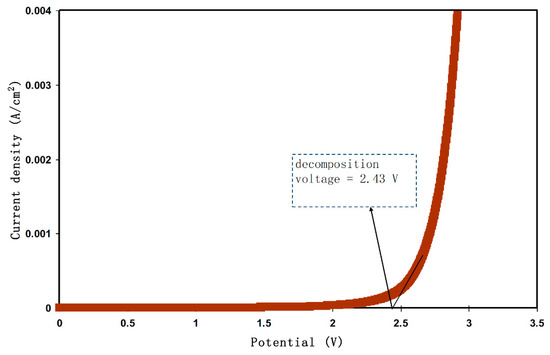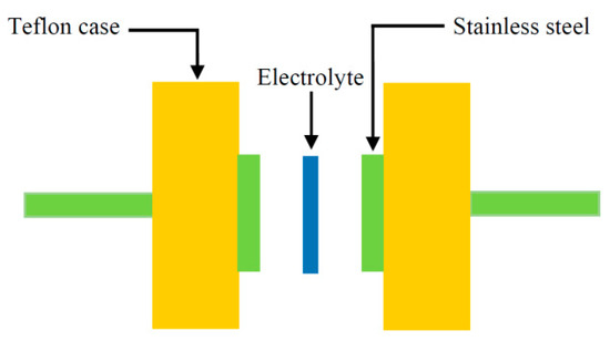 Along with TNM analysis, it is also of great importance to study linear sweep voltammetry (LSV) of the samples to determine the application suitability, in which the electrochemical stability of the samples can be investigated. From Figure 5, the LSV plot for the CSPX4 sample with highest conductivity is shown. The potential window, where the electrochemical stability is examined, is another crucial parameter that has to be evaluated before being used in the electrochemical devices (e.g., supercapacitors) [58]. In the recording LSV, two stainless steel electrodes were used to check the electrochemical stability of the polymer electrolyte as schematically presented in Figure 6. Within the potential window from 0 V to 3 V, a relatively large current is recorded at a certain potential at a sweep rate of 5 mV s−1. From an EDLC application perspective, the results revealed a satisfactory finding that the potential window of the blend is electrochemically stable within 2.43 V [59]. Monisha et al. [60] have shown a threshold potential during the current flowing through the cells. Shukur et al. [61] have documented a decomposition potential at 2.10 V for lithium salt-based biopolymer electrolyte. It is concluded that the obtained potential stability (potential window) of the relatively high conducting electrolyte in the present work is suitable for energy storage device applications. However, in our work, the increase in current beyond 2.43V was attributed to the electrolyte decomposition at the inert electrode surface [62]. In comparison to ammonium salt-based polymer electrolytes, the data results are quite close. Likewise, in another work, a plasticized system of chitosan-polyvinyl alcohol-NH4NO3 showed an electrochemical stability up to 1.70 V as documented by Kadir and Arof [63]. Noor and Isa [64], have also examined the cellulose-NH4SCN system, which was electrochemically stable up to 1.70 V.