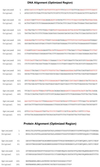 Codon optimization technology is a commercialized algorithm for heterologous gene expression. The DNA sequence used to encode a protein varies between different organisms. To obtain a high expression level in the new host, changing the foreign DNA sequence into that which matches the host requirements for expression is frequently required [27,28].