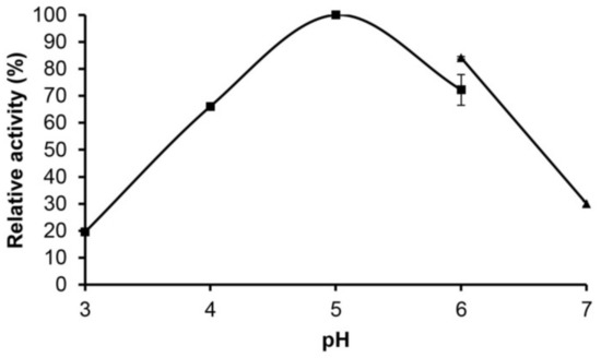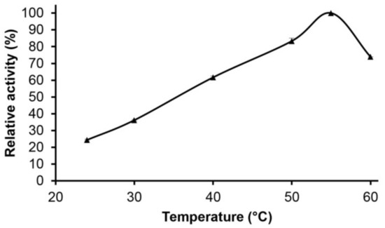 The effect of pH on the xylanase activity of the purified Pc Xyn11A was determined within the pH range of 3.0–7.0 using xylan as a substrate in citric acid–sodium citrate buffer (pH 3.0–6.0) and sodium phosphate buffer (pH 6.0–7.0) at 50 °C, whilst the optimum temperature of the purified Pc Xyn11A was evaluated at 25 °C (room temperature) to 60 °C using xylan as the substrate at the determined pH optimum.