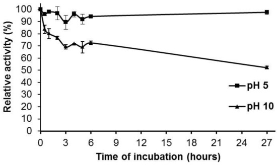 Stability of the purified Pc Xyn11A at pH 5.0 and 10.0 at room temperature measured under a standard enzyme assay condition.