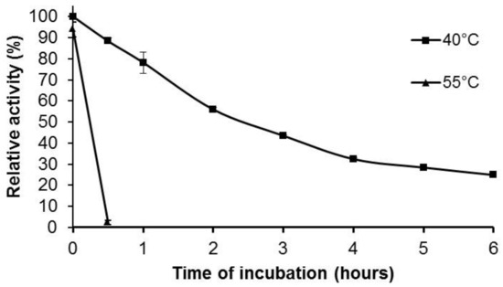 Thermal stability of purified Pc Xyn11A at 40 and 55 °C measured under a standard enzyme assay condition.