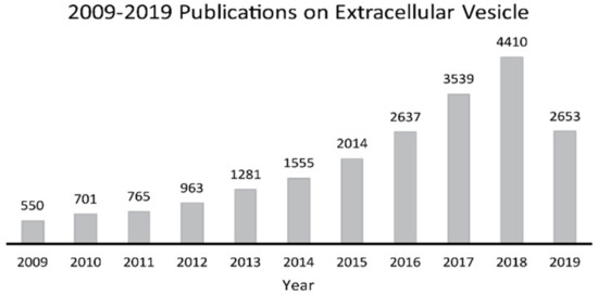 Publication trends on extracellular vesicle studies in the past decade (2009.1 to 2019.7). Publications were selected by searching the keyword “extracellular vesicle” in the Web of Science from the year of 2009.1 to 2019.7. x axis: year; y axis: number of publications.