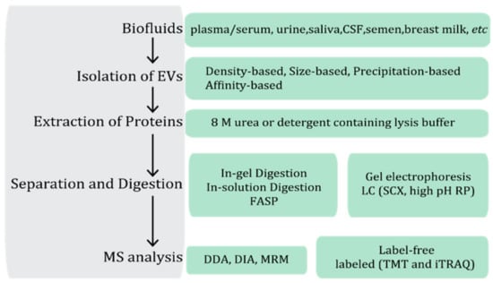 EVs in biofluids are several orders of magnitude lower than other abundant components, such as lipoprotein particles, protein aggregates, and soluble proteins, including albumin in blood and Tamm-Horsfall protein (THP) in urine, which could interfere with the characterization of EVs [15,16]. Thus, the isolation step is required for all EV studies. In a typical MS-based bottom-up proteomic workflow, an additional isolation step for EVs is applied before the protein extraction and digestion (Figure 2). The commonly used isolation methods are either through the physical property of EVs, such as density and size, or based on the chemical property of EVs, such as through interacting with surface proteins of EVs, to achieve isolation [15]. Even though microfluidics-based devices hold promising potential for rapid and efficient isolation of EVs from biofluids, their low processing capacity greatly limits the downstream analysis due to the insufficient amounts of proteins [17]. Hence, this review will discuss the isolation methods, which could provide successful downstream MS-based proteomic EV studies and give an update for the ten-year improvements on isolation methods which are used in MS-based workflow studies.