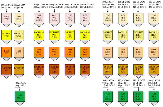 Macroconidia of studied F. culmorum (FcCBS122 and DEM Fc37) and F. oxysporum (FoCBS129 and DEM Fo38) strains used for the preparation of inocula were obtained from a culture grown on a liquid RB medium with 1.0% glucose as a carbon source. The isolates were cultivated in darkness at 20 °C and 60% relative humidity in an Innova 4900 growth chamber (New Brunswick Scientific, Edison, NJ, USA) at 120 rpm for 7 days. Then, the fungal cultures were filtered through 5 layers of a sterile cotton gauze. The macroconidia were obtained by centrifuging the supernatants (10,000 g for 15 min). The supernatant was then collected and the resulting conidia pellet was resuspended in sterile distilled water. The density of the macroconidia suspension was determined in a hemocytometer using a light microscope (Olympus BX53 Upright Microscope) and then diluted with sterile distilled water to a desired concentration [].