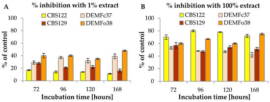 The percentage inhibition of mycelial growth of Fusarium culmorum (CBS122, Fc37) and Fusarium oxysporum (CBS129, Fo38) strains on PDA medium with addition of (A) 1% and (B) 100% F. vesiculosus extract, after 72 h, 96 h, 120 h and 168 h of incubation in a comparison with the control.