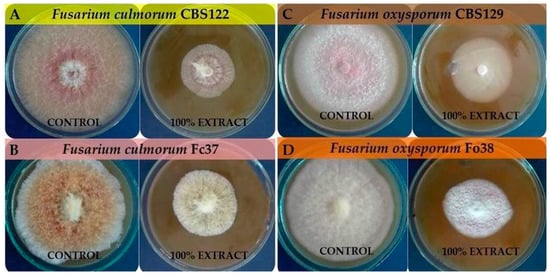 Nowadays, the most common method for plant protection against phytopathogenic fungi is the use of chemical fungicides. These products are characterized by a high effectiveness, however, concerns regarding the safety and health of food mean that alternative methods of combating phytopathogens are being sought []. In order to limit the negative effects of the use of non-biological plant control agents, studies are being conducted to develop environmentally friendly crop technologies based on the use of soil microorganisms or their metabolites and natural products (plants extracts) in accordance with the assumption of integrated pest management (IPM) and organic farming [,]. Manni et al. [] studied the influence of five chemical fungicides, such as Prodazin (Carbendazim), Dithane (mancozeb), Alliette Express (Fosetyl-Al), Tachigazol (Hymexazol) and Beltanol (Chinosol) in the concentration range of 10, 25, 50 and 100 ppm against Fusarium oxysporum. The best results were observed for Tachigazol and Beltanol, with the highest F. oxysporum inhibition ability among all the tested fungicides being that of Beltanol. After 144 h of incubation, F. oxysporum was inhibited by over 90% and 70%, respectively, by Beltanol (100 ppm) and Tachigazol (100 ppm). The least effective was Alliette Express (Fosetyl-Al) with F. culmorum inhibition by 7.03% (10 ppm) and 0.61% (100 ppm). In another study, the increase of Fusarium growth inhibition was noticed with the increase of the concentrations of fungicides, such as propiconazole (250 g/L), metconazole (60 g/L) and tebuconazole (250 g/L) []. In the triazole group, metconazole showed the strongest inhibitory effect on the growth of all tested fungi. The growth of Fusarium culmorum and Fusarium oxysporum was inhibited by 100% and 70%–100%, respectively. The results provided in this study, indicate that F. vesiculosus scCO2 extract may be used as a potential additive to biological plant protection products as the extract was characterized by a high inhibitory effect on Fusarium culmorum and Fusarium oxysporum, similar to the effect caused by the chemical fungicides. Moreover, the extracts obtained with the use of supercritical carbon dioxide are free of solvents, as carbon dioxide is removed by depressurization []. Figure 3 presents the effect of 100% F. vesiculosus extract on F. culmorum (CBS122, Fc37) and F. oxysporum (CBS129, Fo38) on PDA medium after 168 h of incubation.