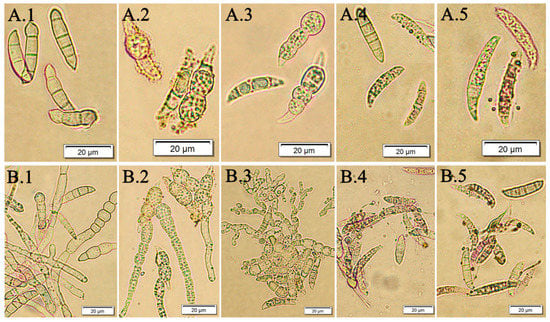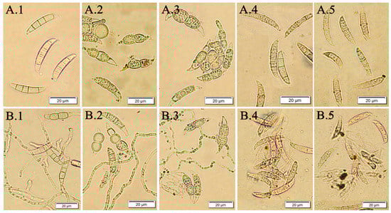 F. culmorum DEMFc37 treated with F. vesiculosus RB extract (RB.E) after 120 h incubation, (A) non-germinated; (B) germinated macroconidia with hyphae of different length; (1) RB control (RB.C); (2) 0.05%; (3) 0.2%; (4) 0.5%; (5) 1.0%.