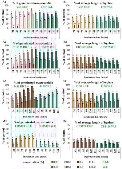 In the case of F. culmorum Fc37, the germination of macroconidia was strongly inhibited when 0.5% and 1.0% extracts were applied, which also corresponded to no increase of average length of hyphae in an experiment with the extract and conidia (Fc37 W.E). It was observed that 0.5% extract in Fc37 RB.E samples was effective after 48 h of incubation. It may be assumed that the spores of F. culmorum Fc37 were able to feed themselves with RB-medium nutrients within 48 h. Similarly to Fc37, the spores of F. culmorum CBS122 were proven to be inhibited by the addition of 0.5% and 1.0% extract in FcCBS122 W.E samples, whereas FcCBS122 RB.E samples were characterized by the percentage of germinated spores in the range of 7%–21% (24–144 h of incubation), as well as the average percentage of hyphae length at the level of 6%–8% (24–144 h of incubation) (Figure 6(A1, B1, A2, B2)).