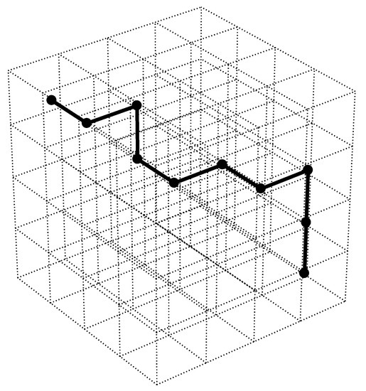 Visual representation of Equation (4) showing a three-dimensional lattice of a polymer solution mixture. , total number of lattice sites (all cubes): , number of solvent molecules (empty cubes); and , number of polymer repeat units (cubes with black dots connected with black lines) [30].