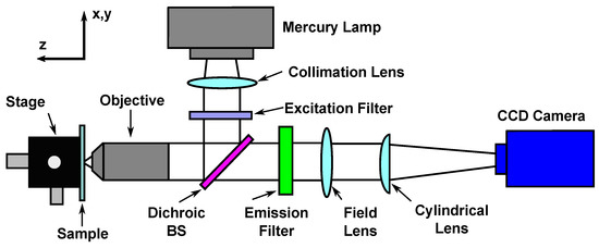 Schematic of a particle tracking velocimetry (PTV) setup used to quantify the transient swelling of hydrogels in three dimensions [97]; adapted from [96]. Placing a cylindrical lens in front of the CCD (charge-coupled device) camera creates an anamorphic imaging system, resulting in different optical properties in the x and y directions. Combining the x and y projections allows for the information of the z-dimension to be calculated [102]. (BS = beamsplitter)