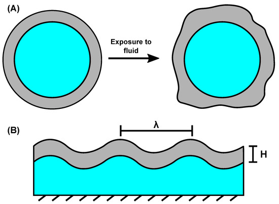 The morphological buckling response of soft materials can be categorized into three phenotypes: Wrinkling, folding, and creasing [110]. Wrinkling is defined as periodic surface fluctuations formed on an originally smooth surface, folding as deep localized valleys, and creasing as self-contacting ridges. Each of these are a consequence of an elastic surface layer which is free to swell around an attached stiffer core, or vice versa [111]. This mechanical constraint is created when fluid diffuses into a gel, but has not yet permeated to the core. Compressive surface stresses cause the surface to buckle. The magnitude of the buckling (and, hence, the phenotype) is dependent on the magnitude of the compressive surface stress, as well as the wavelength of the pattern (denoted as in Figure 4B). Both of these are also dependent on the thickness of the buckling layer (also denoted in Figure 4B, as H) [11,111].