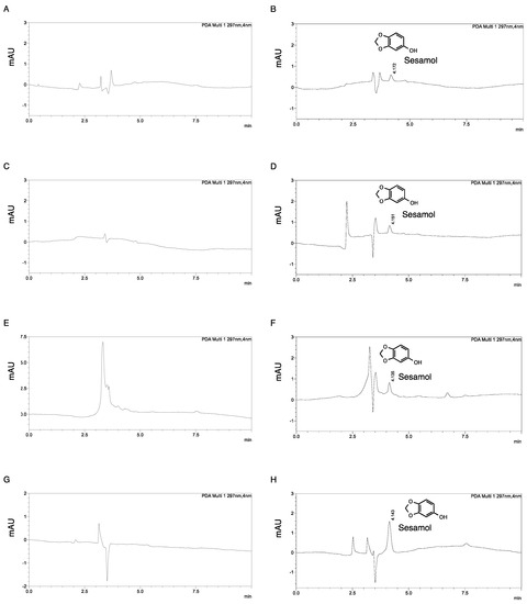 Chromatogram of sesamol in various solvents: (A) acetonitrile, (B) 20 ng/mL sesamol in acetonitrile, (C) 0.1 M sodium hydroxide, (D) 20 ng/mL sesamol in 0.1 M sodium hydroxide, (E) 100 mM hydrochloric acid, (F) 20 ng/mL sesamol in 100 mM of hydrochloric acid, (G) methanol, and (H) 20 ng/mL sesamol in methanol.