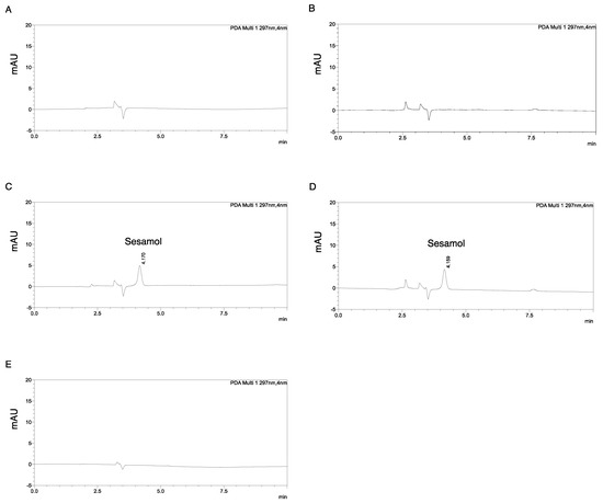 HPLC chromatograms of analytes detected at 297 nm. (A) Methanol solvent, (B) prepared SK-MEL-2 cell lysate, (C) sesamol dissolved in methanol (final concentration of 900 ng/mL), and (D) SK-MEL-2 cell lysate spiked with sesamol (final concentration of 900 ng/mL). Additional peaks of sesamol in (C) and (D) appeared at retention times of 4.152 ± 0.008 min (n = 10). (E) Carryover effect showed no leftover peak of sesamol after an injection of 900 ng/mL sesamol for 10 min followed by methanol solvent.