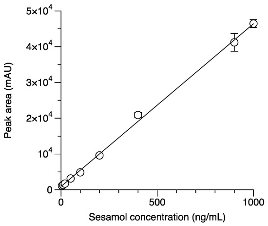 A stock solution of sesamol was prepared in methanol and stored at 4 °C until use. The calibration curve for the standard sesamol solution (5, 10, 20, 50, 100, 200, 400, 900, 1000 ng/mL) was done using the stock sesamol solution and HPLC analysis. The standard curve of sesamol was determined each time the experiment was conducted.