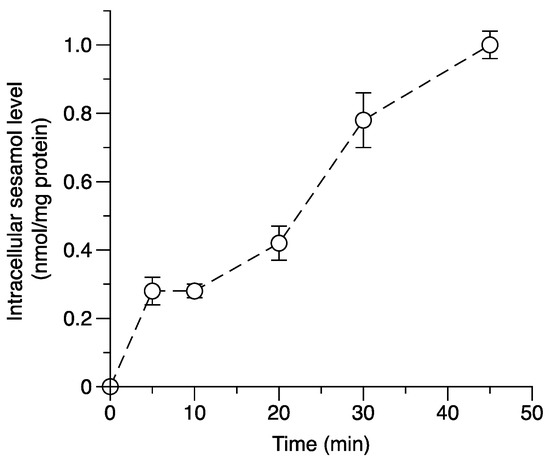 The time course relationship of the intracellular sesamol level (1 mM sesamol in SK-MEL-2 cells). The data were observed from 5 min to 45 min. The data are from three replicates.